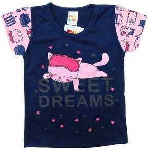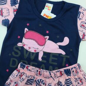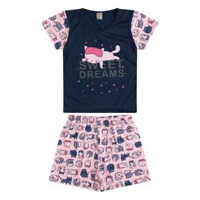 Pijama Infantil Menina Blusa Azul Marinho e Estampa Gatinha - Conforto e charme com estampa de gatinha e bermuda estampada.