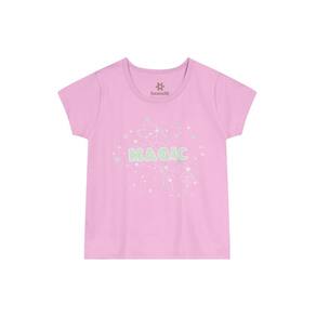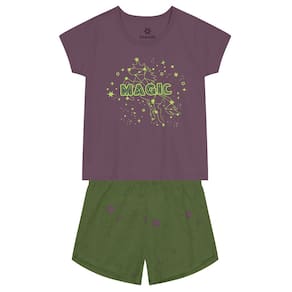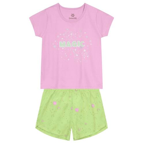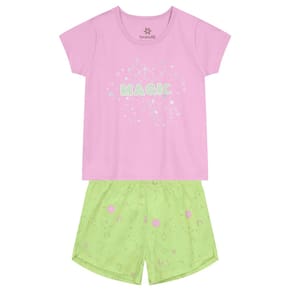 Este conjunto de pijama infantil feminino é perfeito para as pequenas exploradoras. A blusa de manga curta, confeccionada em malha, possui uma estampa localizada de constelações com a palavra "Magic" em metalizado, enquanto o shorts, com estampa rotativa de galáxia que brilha no escuro, e cós elástico, completa o visual com um toque cósmico. Tradução: Busque sonhos mágicos.