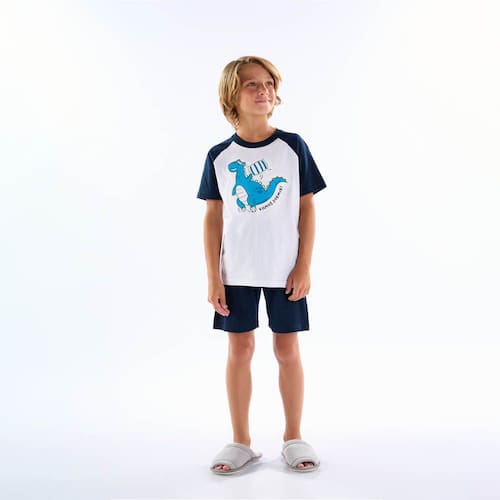 Pijama infantil para manter a noite dos meninos ainda mais confortável e fresquinha. Composto por camiseta e bermuda meia malha. Camiseta manga curta na cor branca com mangas na cor marinho, gola reforçada e estampa frontal de dinossauro que brilha no escuro - a diversão começa até na hora de dormir - e a bermuda na cor marinho com elástico na cintura para maior conforto.