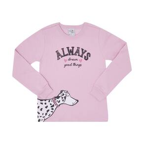 Os pijamas estão cada vez mais divertidos e cheios de estilo para uma boa noite de sono! Invista neste conjunto que é a cara da estação, a blusa de manga longa na cor lavanda possuí estampa de dálmata na lateral e escrita frontal "Sempre sonhe coisas boas" . A calça com estampa rotativa de manchas de dálmata possuí elastano no cós. Ambas as peças são confeccionadas em moletinho garantindo conforto durante a noite toda!\n