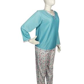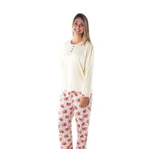 Pijama feminino com blusa em malha lisa, decote redondo com acabamento em malha estampada e 3 botoes. Calça em malha estampada longa, com elástico no cós.
