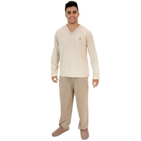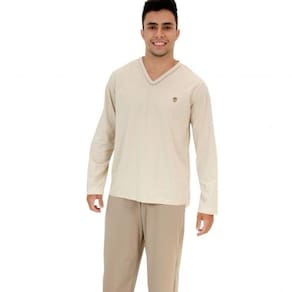 Pijama Masculino Conjunto Calça e Blusa Manga Longa Malha Algodão Puff - Bege Claro - EG