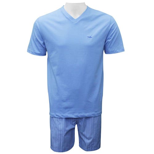 Pijama masculino curto fabricado pela Fitswell com blusa em malha 100% Algodão lisa, com gola V curta, compondo com short 100% tricoline listrado, vista fechada e elastico na cintura. Produto durável e confortável ideal para utilizar em ambientes com mais pessoas.