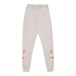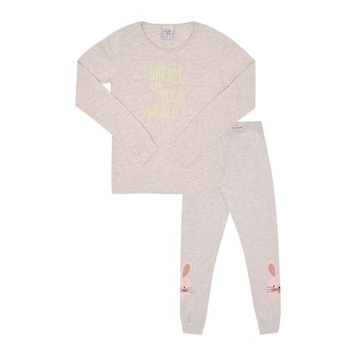 Chegou a estação mais fria do ano, é hora de pijama quentinho e confortável para o sono de beleza das meninas! O conjunto é todo confeccionado em meia malha na cor mescla banana. A blusa de manga longa possuí estampa frontal com escrita "Sonhe em seu mundo" e o detalhe divertido da peça é que a estampa brilha no escuro. A calça além de proporcionar conforto e segurança por ter elastano na cintura, possuí também estampas de coelhos nas laterais da perna.\n