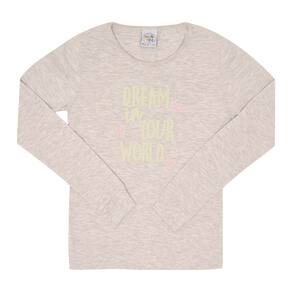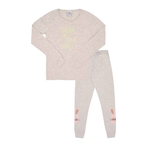 Chegou a estação mais fria do ano, é hora de pijama quentinho e confortável para o sono de beleza das meninas! O conjunto é todo confeccionado em meia malha na cor mescla banana. A blusa de manga longa possuí estampa frontal com escrita "Sonhe em seu mundo" e o detalhe divertido da peça é que a estampa brilha no escuro. A calça além de proporcionar conforto e segurança por ter elastano na cintura, possuí também estampas de coelhos nas laterais da perna.\n