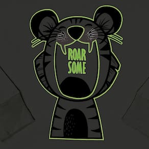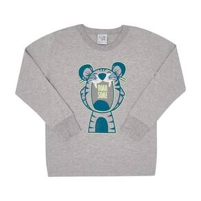 Pijama manga longo confeccionado em meia malha para os pequenos aventureiros. A camiseta na cor mescla cinza possuí estampa divertida de tigre bocejando com escrita "Rugido curto" e o detalhe esta na estampa que brilha no escuro. A calça na cor petróleo possuí elastano na cintura para maior conforto na hora do sono. O pijama favorito dos pequeninos para a estação!\n