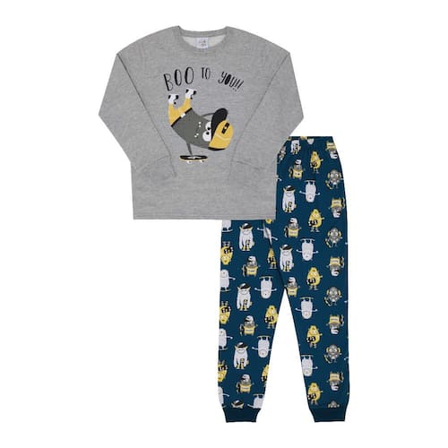 Nesse inverno a Good Night by Pulla Bulla trouxe para seu pequeno um novo Conjuntinho confeccionado em moletinho para uma noite com muito mais conforto, um Blusão na cor Mescla cinza com estampa com um mostro radical e uma Calça na cor Azul Marinho com estampa rotativa de monstrinhos para que a noite de seu pequeno seja ainda mais divertida.\n