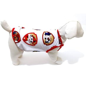 Pijama confeccionada em malha PV poliéster com viscose na cor branca; Estampa temática do Personagem Patrulha Canina; Acabamento em cotton vermelho; Tamanho : EG; Cor: Branca; Medidas aproximadas: 47 cm de comprimento, 65 cm de circunferência torax, 41 cm pescoço; Deixe seu Pet super estiloso com seu personagem favorito. Marca: Não Informado Ean: 7439589110399