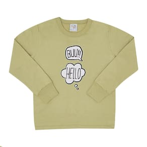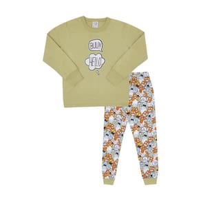 Quentinho e divertido para aquecer os meninos durante a estação. Confeccionado em moletinho, o blusão de manga longa na cor pistache possuí estampa frontal com escrita "buu!" "Hello" e ambas brilham no escuro também. Já a calça possuí estampa rotativa na cor pistache de pequenos fantasmas e seres divertidos além de possuir elastano no cós. \n