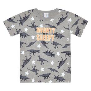 Seu pequeno aventureiro descansando com os dinos. Confeccionado em tecido meia malha, este pijama possuí estampa rotativa de dinossauros na cor mescla cinza tanto na camiseta quanto no short. A camiseta possuí a frase “mighty sleepy” (muito sonolento) localizada no centro da peça. E para deixar a noite mais divertida, a frase estampada na camiseta brilha no escuro.\n