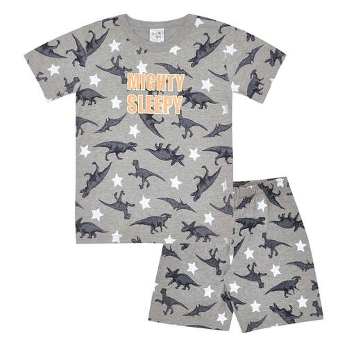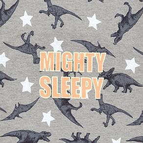 Seu pequeno aventureiro descansando com os dinos. Confeccionado em tecido meia malha, este pijama possuí estampa rotativa de dinossauros na cor mescla cinza tanto na camiseta quanto no short. A camiseta possuí a frase “mighty sleepy” (muito sonolento) localizada no centro da peça. E para deixar a noite mais divertida, a frase estampada na camiseta brilha no escuro.\n