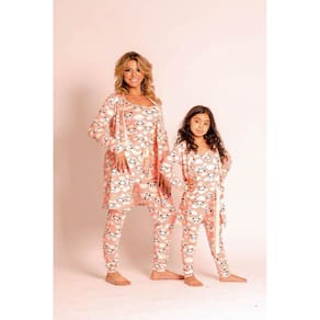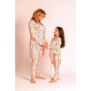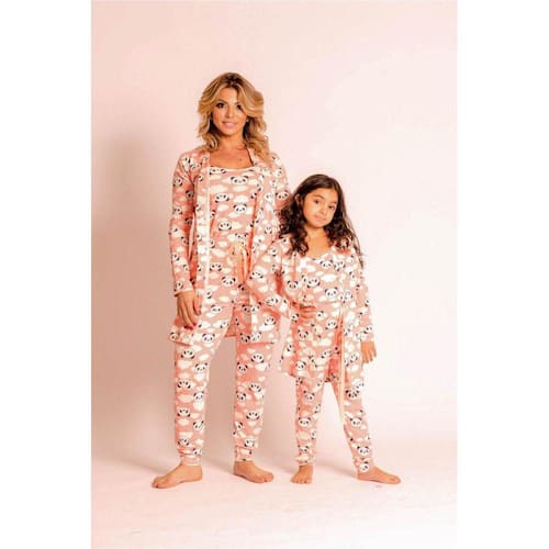 Pijama Urso Adulto, possui uma calça de tecido leve com elástico na cintura e fita de cetim de amarração, uma blusinha regata com alças finas e um kimono com botões de fecho e fenda nas laterais. Todas as peças são do mesmo tecido com estampa de ursinho e nuvens brancas. Este conjunto traz conforto ao toque na pele por conta da leveza de seu tecido. Código do Produto: 79364 Marca: Khalli