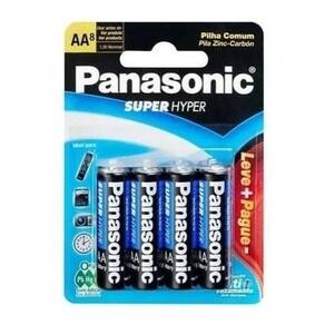Marca: panasonic Linha: comum super hyper Modelo: pequena Tamanho da pilha: aa Forma: cilíndrica Formato de venda: display Unidades por kit: 8 Voltagem nominal 1.5v Tipo da pilha: não recarregáveis