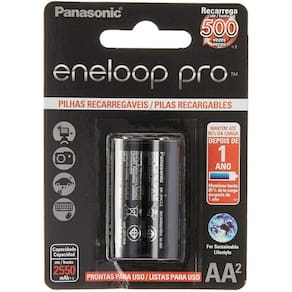 As pilhas recarregáveis Eneloop Pro da Panasonic vem prontas para o uso, 100% carregadas. Destacam-se pela alta performance, de até 2550 mAh. Elas podem ser recarregadas até 500 vezes, sendo uma excelente opção para fotógrafos. Após 1 ano de uso, a capacidade de carga é mantida em 85%. Caso seja recarregada 2x por semana, terá cerca de 5 anos de vida útil. Com as pilhas Eneloop Pro, você economiza no custo de substituição de baterias e reduz o desperdício. Características: - Pilhas recarregáveis - Pré-carregada com energia solar sustentável na fábrica - Pode ser usada imediatamente após a compra - Mantém até 85% da carga depois de 1 ano - Recarrega até 500 vezes - Alta capacidade para equipamentos de alta descarga Especificações técnicas Marca: Panasonic Modelo: Eneloop Pro Tamanho: AA Tamanho em mm: 50,0mm de altura x 14,7mm de diâmetro Quantidade: 2 peças Recarregáveis: Sim Capacidade: 2550 mAh Voltagem nominal: 1,2V Dimensões aproximadas: 8 x 1,3 x 12 cm
