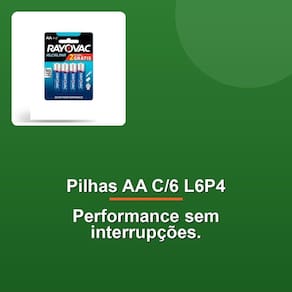 Pilha Alcalina Aa C/6 L6p4 Desfrute de total liberdade em suas atividades tecnológicas com as Pilhas Alcalinas AA Com 6 L6p4 - 20871. Especificamente projetadas para aparelhos com alto consumo de energia, essas pilhas permitem que você realize suas tarefas sem preocupações com a duração da bateria. Além disso, as Pilhas Alcalinas Rayovac são conhecidas por sua confiabilidade e performance. Com isso, você pode ter certeza de que seus dispositivos estarão sempre prontos para uso. Além disso, essas pilhas são projetadas para fornecer uma potência constante, mesmo quando você precisa de mais energia.