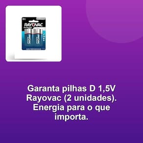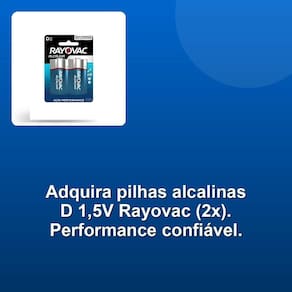 Com a nossa paixão pela excelência, cada membro da nossa equipe trabalha arduamente para proporcionar a você produtos que possam confiar e se orgulhar de utilizar. Não há compromisso com a qualidade e a satisfação do cliente. Desbloqueie sua liberdade com as pilhas Alcalinas Rayovac! Indicadas para aparelhos tecnológicos e com alto consumo de energia, essas pilhas permitem que você realize suas atividades sem limites. Ideal para brinquedos, câmera fotográfica, controle de video-games e muito mais, essas pilhas Alcalinas tamanho D 1,5V com 2 unidades irão superar suas expectativas.