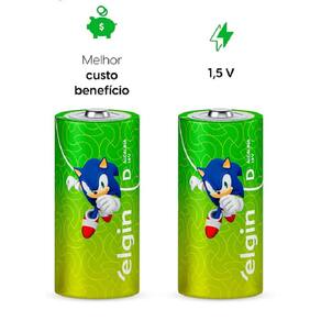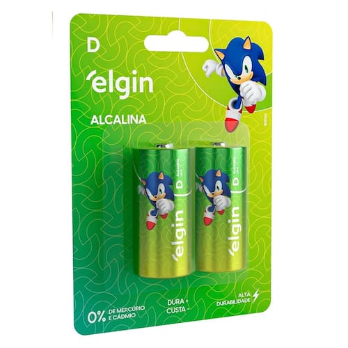 ESPECIFICAÇÕES DO PRODUTO: Marca: Elgin. Contém: 1 Blister com 2 unidades. Dimensões: 61,5 x 34,2 mm. Voltagem: 1.5 Volts. 0 % de Metais Pesados. Modelo: Alcalina D grande. NÃO É RECARREGÁVEL. Alta Durabilidade. Economia e Qualidade.