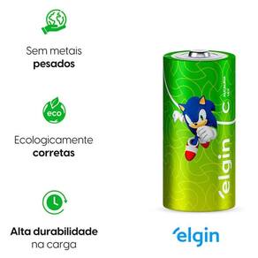 As pilhas alcalinas C Elgin do mascote Sonic são ideais para brinquedos, controle remotos, lanternas e outros aparelhos que requerem descargas de energia rápidas e fortes. Elas foram aprovadas em todos os quesitos e têm ótima relação custo/benefício, você economiza e ainda conta com pilhas de alta qualidade. Entre 11 marcas de pilhas do mercado avaliadas em testes do INMETRO, as pilhas Elgin apresentaram um resultado excelente na relação custo por hora útil. Além disso, elas são testadas periodicamente por laboratórios credenciados pelo INMETRO, para garantir a qualidade e conformidade com a resolução Conama 401.