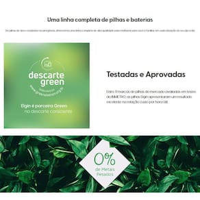 Energia Sustentável para o Seu Dia a Dia Descubra nossas descargas de energia leves e contínuas, perfeitas para impulsionar seus relógios de parede. As pilhas Elgin são a escolha ideal, proporcionando uma combinação imbatível de economia e qualidade. Economia e Qualidade Garantidas: Nossas pilhas foram aprovadas em todos os aspectos, oferecendo uma excelente relação custo/benefício. Ao escolher as pilhas Elgin, você não apenas economiza, mas também desfruta de energia de alta qualidade. Testadas e Aprovadas pelo INMETRO: Comparadas a 11 marcas concorrentes, as pilhas Elgin se destacaram nos testes do INMETRO, mostrando um desempenho excepcional na relação custo por hora útil. Nossa dedicação à qualidade é comprovada por testes periódicos em laboratórios credenciados pelo INMETRO, garantindo conformidade com a resolução Conama 401. Ecologicamente Corretas: Comprometidas com o meio ambiente, as Pilhas Elgin são totalmente livres de metais pesados, contribuindo para a preservação do ecossistema. Faça a escolha sustentável e energize seus dispositivos sem prejudicar a natureza. Linha Completa para Todas as Necessidades: Desde pilhas de zinco até baterias recarregáveis, nossa linha completa de produtos de alta qualidade está pronta para atender a todas as suas necessidades diárias. Facilite sua vida em cada situação, contando com a confiabilidade das Pilhas Elgin. Faça a escolha inteligente para a energia do seu dia a dia. Escolha Pilhas Elgin - Potencializando Seu Mundo, Respeitando o Nosso Planeta.