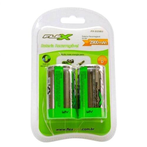 Pilha Bateria D Recarregável 2900mah 1.2v C/ 2 Unidades - Flex Gold As pilhas recarregáveis FlexGold possuem a praticidade das pilhas alcalinas com a economia das recarregáveis, não havendo necessidade de carga inicial. Basta retirar do blister e utilizar; O tempo de carga as pilhas é relativo ao carregador utilizado; 1 pilha Flex recarregável vale por até 1.000 pilhas comuns As pilhas e baterias recarregáveis que podem ser utilizadas em brinquedos, lanternas, controles de vídeo game, câmeras fotográficas, mini DVD players, MP3 players, vídeo games portáteis, aparelhos de comunicação sem fio, filmadoras, entre outros. Ni-Mh/ 1.2V/ 2900mAh Tabela tempo de carga: Carregador 150mAh de saída - 16h; Carregador 250mAh de saída - 10h; Carregador 350mAh de saída - 7h; Carregador 450mAh de saída - 6h. ***A durabilidade pode variar de acordo com o padrão de uso. Código: 049729 Dimensões aprox. da embalagem em cm: 5x11x17 Peso liq. Aproximado do produto na embalagem: 166g Referência do Modelo: FX-D29B2 Conteúdo da Embalagem: 2 Pilhas Recarregáveis D Flex Gold 2900 mAh 1.2v - FX-D29B2 Garantia: 90 dias contra defeitos de fabricação pelo fabricante Imagens meramente ilustrativas. As cores e tonalidades podem variar. Cor - Preto