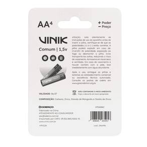 PILHA COMUM AA C/4 1.5V - VP2AB4C As pilhas e baterias Vinik são a escolha perfeita para diversas situações, oferecendo desempenho confiável e durabilidade para todos os tipos de dispositivos. Seja para controles remotos, videogames, lanternas, sensores, brinquedos ou muitos outros aparelhos, nossas pilhas garantem energia quando você mais precisa. Disponíveis em uma ampla variedade de tipos e tamanhos, projetadas para atender às suas necessidades com eficiência e qualidade. Mais potência por menos preço. Características Tipo: Comum Tamanho: AA Voltagem: 1,5V Blister: 4 unidades