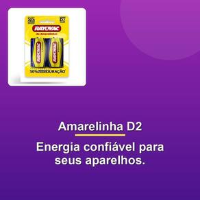 As Amarelinhas, pilha de zinco de tamanho D, são a solução econômica para aparelhos que consomem pouca energia. Ideal para controles remotos de televisão e relógios de parede, entre outros, essa pilha comum grande D2 com 2 10298 é a escolha certa para quem procura uma fonte de energia confiável e durável.