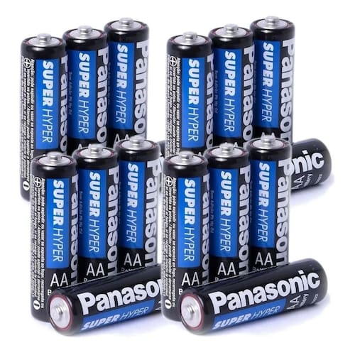 marca: panasonic linha: comum super hyper modelo: pequena tamanho da pilha: aa forma: cilíndrica formato de venda: display unidades por kit: 16 voltagem nominal 1. 5v tipo da pilha: não recarregáveis