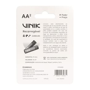PILHA RECARREGÁVEL AA C/2 - 2200MAH - VP2AB2R As pilhas e baterias Vinik são a escolha perfeita para diversas situações, oferecendo desempenho e durabilidade para todos os tipos de dispositivos. Seja para controles remotos, videogames, lanternas, sensores, brinquedos ou muitos outros aparelhos, nossas pilhas garantem energia quando você mais precisa. Disponíveis em uma ampla variedade de tipos e tamanhos, projetadas para atender às suas necessidades com eficiência e qualidade. Mais potência por menos preço. Características Tipo: Recarregável Tamanho: AA Voltagem: 1,2V Blister: 2 unidades