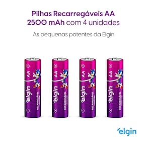 Pilha Recarregável AA Comum - 2.500mah Blister Com 4 Unidades As pilhas recarregáveis AA 2.500mAh Elgin do mascote Sonic são ideais para brinquedos, controle remotos, lanternas e outros aparelhos que requerem descargas de energia rápidas e fortes. Elas foram aprovadas em todos os quesitos e têm ótima relação custo/benefício, você economiza e ainda conta com pilhas de alta qualidade. Entre 11 marcas de pilhas do mercado avaliadas em testes do INMETRO, as pilhas Elgin apresentaram um resultado excelente na relação custo por hora útil. Além disso, elas são testadas periodicamente por laboratórios credenciados pelo INMETRO, para garantir a qualidade e conformidade com a resolução Conama 401.Embalagem com 2 pilhas alcalinas tipo AA 2.500mAH Ean: 7897013536090