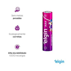 4 Pilhas Recarregáveis AAA 900mAh Elgin – Energia Sustentável e Econômica em Dobro As pilhas recarregáveis Elgin AAA 900mAh unem eficiência energética e respeito ao meio ambiente. Ideais para dispositivos de baixo a médio consumo, como controles, mouses, brinquedos e lanternas. O blister com 4 unidades oferece praticidade e ótimo custo-benefício. Detalhes Técnicos• Marca: Elgin• Modelo: AAA 900mAh• Tipo: Pilha recarregável• Tamanho: AAA (palito)• Capacidade nominal: 900mAh• Voltagem: 1,2V• Tecnologia: Níquel-Hidreto Metálico (Ni-MH)• Recarregável: Sim• Ciclos de recarga: Até 1000 recargas (com uso adequado)• Aplicações indicadas: Controles remotos, brinquedos, mouses e teclados sem fio, lanternas, relógios e outros eletrônicos de uso contínuo• Peso unitário: Aproximadamente 13 g• Origem: Nacional Vantagens:Reutilizáveis até 1000 vezesRedução de resíduos e economia a longo prazoCompatíveis com carregadores padrão Ni-MHAlta eficiência energética para uso diário As pilhas Elgin AAA 900mAh recarregáveis são a escolha ideal para quem deseja reduzir custos e contribuir com o meio ambiente. Com 4 unidades por blister, são perfeitas para o uso doméstico ou profissional, oferecendo potência constante e durabilidade em qualquer ocasião.