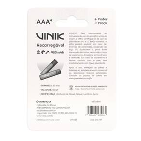 PILHA RECARREGÁVEL AAA C/4 - 900MAH 1.2V - VP3AB4R As pilhas e baterias Vinik são a escolha perfeita para diversas situações, oferecendo desempenho confiável e durabilidade para todos os tipos de dispositivos. Seja para controles remotos, videogames, lanternas, sensores, brinquedos ou muitos outros aparelhos, nossas pilhas garantem energia quando você mais precisa. Disponíveis em uma ampla variedade de tipos e tamanhos, projetadas para atender às suas necessidades com eficiência e qualidade. Mais potência por menos preço. Características Tipo: Recarregável Tamanho: AAA (palito) Voltagem: 1,2V Blister: 4 unidades