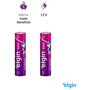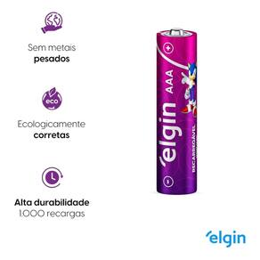 - Marca: Elgin; - Referência: 66733-1; - Composição das células da bateria: NiMH; - Energia renovável de alta qualidade, as pilhas recarregáveis da Elgin suportam até 1000 recargas; - Ecologicamente corretas: As Pilhas da Elgin têm 0% de Mercúrio e Cadmio em sua composição, colaborando para a preservação do meio ambiente; - Indicada para brinquedos, controle de videogames e produtos de alto consumo de pilha; - Peso: 10 g; - Aprovadas pelo INMETRO: As Pilhas Elgin Energy são testadas periodicamente por laboratórios credenciados pelo INMETRO, para garantir a qualidade e conformidade com a resolução Conama 401.