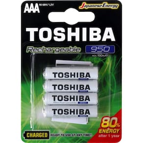 As pilhas recarregáveis AAA da TOSHIBA de 950mAh foram desenvolvidas com matéria-prima de altíssima qualidade e podem ser recarregadas mais 500 vezes em sua vida útil.