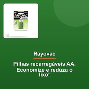 Com as pilhas recarregáveis Rayovac, você reduz drasticamente o impacto ambiental de pilhas descartadas. Além disso, elas não têm efeito memória, ou seja, não perdem sua capacidade se não são recarregadas completamente. Disponíveis nos dois principais tamanhos comerciais, AA (1350 mAh) e AAA (600 mAh), estas pilhas recarregáveis são ideais para seu uso diário.