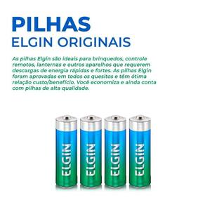 APROVADAS PELO INMETRO As Pilhas Elgin Energy são testadas periodicamente por laboratórios credenciados pelo INMETRO, para garantir a qualidade e conformidade com a resolução Conama 401. Indicadas para equipamentos tecnológicos que requerem descargas de energia rápidas e fortes, como brinquedos, câmeras fotográficas digitais, MP3 players, lanternas, fechaduras eletrônicas, aparelho de aferir pressão, as Pilhas e Baterias Elgin Energy apresentam ótima relação custo/benefício, garantindo alta durabilidade. Colaboram para a preservação do meio ambiente, pois não apresentam metais pesados em sua composição com 0% de Cádmio e Mercúrio.