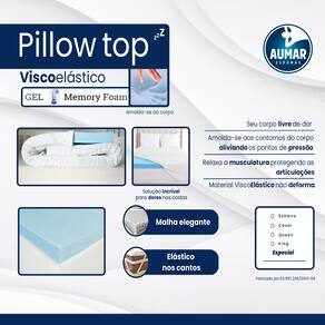 Indicado para quem precisa de maciez extra sobre o colchão muito firme . DENSIDADE 50 Kg/ m³ O Pillow Top Viscoelástico Gel Infusion é extremamente macio com alta densidade. Pillow Top Viscoelástico com Micro Pérolas de Gel incorporadas na espuma contribuem para tornar a espuma mais fria , reduzindo a sensação de calor durante o sono Outro benefício desta fórmula com Gel , é produzir uma espuma mais densa , flexível , resistente e indeformável Garantindo qualidade e um conforto superior , quando se comparado a espuma Viscoelástico comum. Alivia os pontos de pressão onde seu corpo é pressionado contra o colchão , como os ombros , quadris e tornozelos . Pontos de pressão provocam desconforto e seu corpo para se sentir mais aliviado muda de posição por várias vezes durante à noite , causando frequentes interrupções do sono . Permite que você encontre sua melhor posição de dormir . Miniminiza os movimentos de se virar no meio da noite , mantem-se dormindo por muito mais tempo na mesma posição , proporcionando um sono mais profundo e restaurador . Facilita a circulação sanguínea , já que os vasos não estão sendo comprimidos . Indicado como material anti escaras , e na prevenção de úlceras de pressão . Previne dores musculares causadas por posições incorretas ao dormir . Hipoalergênico , espuma tratada com aditivos especiais que inibe a proliferação de ácaros , fungos e bactérias prevenindo problemas alérgicos e respiratórios . Adapta-se em qualquer colchão , fácil colocação com elástico. Sem limite de peso, indeformável. Material: Viscoelástico Gel Infusion 100% poliuretano.