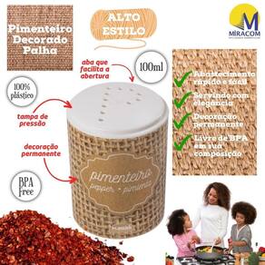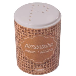 Pimenteiro de plástico redondo 100ml, para mesa e galheteiro, decorado estilo sisal que acompanha tampa de pressão com perfurações que formam a letra P.