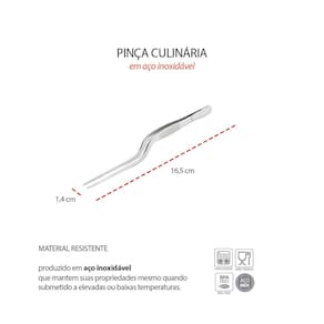 A Pinça Curvada com Ponta Reta é pratica, precisa e elegante, ideal para finalizar pratos com delicadeza e controle. Produzida em aço inoxidavel de alta qualidade, oferece resistencia, durabilidade e excelente desempenho tanto em preparos doces quanto salgados. Seu design ergonomico e anatômico proporciona firmeza e conforto no manuseio, sendo perfeita para chefs, confeiteiros e amantes da gastronomia que valorizam acabamentos impecaveis.