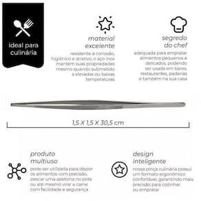 A pinça culinária é um acessório importante na cozinha e muito útil para o preparo de alimentos e pratos exclusivos. As pinças culinárias podem ser usadas para manusear diversos tipos de alimento com bastante firmeza tanto momento do preparo quanto na hora de servir. Elas também são úteis para tirar espinhas de peixe sem quebrar e sem causar dano às fibras do peixe.