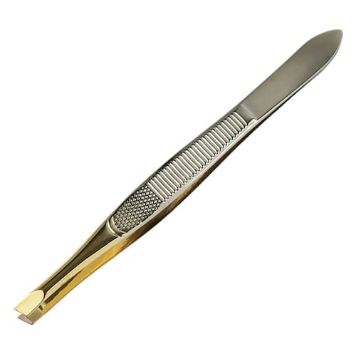 A Pinça Ponta Inclinada Ponta Dourada é feita em aço inoxidável. Ideal para remoção de pelos mais grossos com mais facilidade. A ponta com formato chanfrado facilita delinear os pelos das sobrancelhas.