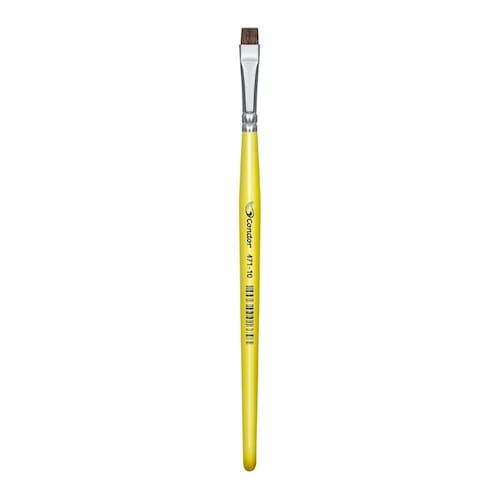 Ponta: pelo de pônei. Cabo: curto plástico amarelo. Virola: alumínio. Indicação de pintura: arte escolar artesanato. Formato: chato. Composição: pelo natural, metal e material sintético.