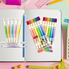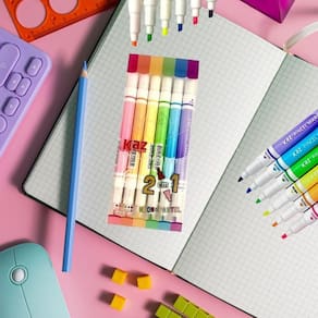 Pincel Marca Texto 2 em 1 da Kaz é perfeito para quem precisa de versatilidade e precisão ao marcar textos. O kit vem com 06 unidades, cada uma com ponta dupla, oferecendo 12 cores vibrantes divididas entre neon e pastel, ideais para diferentes finalidades.