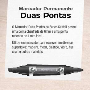 O Marcador Duas Pontas da Faber-Castell possui uma ponta chanfrada de 6mm e uma ponta redondo de 4 mm ideal. Utilize seu marcador para escrever em diversas superfícies: madeira, metal, plástico, vidro, flip chart e outros materiais.