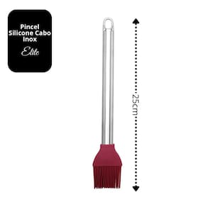 Seu cabo longo em aço inox escovado proporciona pegada firme e confortável, enquanto as cerdas em silicone premium na cor vinho bordô suportam altas temperaturas, não soltam fios e são fáceis de limpar.