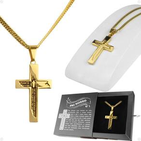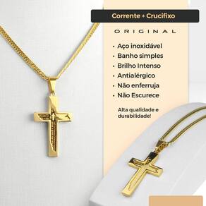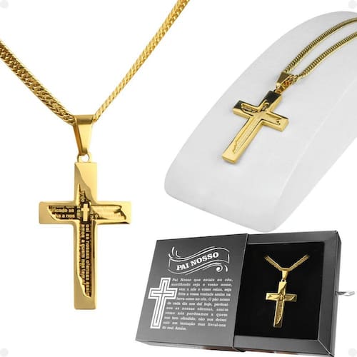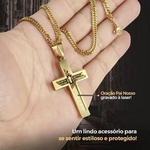 Pingente Crucifixo Religião + Cordão Banhado Ouro + Caixa fé católico cruz hip hop estiloso grosso Cordão Dourado Estilo Grumet com Pingente Grande Crucifixo e Caixa Premium com Gravação do Pai Nosso Apresentamos um item exclusivo e sofisticado, perfeito para expressar sua fé com estilo e qualidade. Este conjunto premium inclui um cordão grosso estilo grumet, um pingente grande em forma de crucifixo com a oração do Pai Nosso gravada a laser em seu interior e uma caixa especial com a oração completa do Pai Nosso gravada a laser. Ideal para presentear ou para uso pessoal. Itens inclusos: - 1 Cordão dourado estilo grumet: confeccionado em aço inox com banho dourado de alta qualidade, comprimento aproximado de 67 cm. Design robusto e elegante para quem busca um acessório marcante. - 1 Pingente grande em forma de crucifixo: confeccionado com banho dourado de alta qualidade, com a oração do Pai Nosso gravada a laser de alta precisão, garantindo um visual exclusivo e significativo. - 1 Caixa ultra premium preta: material de alta qualidade com gravação a laser da oração completa do Pai Nosso. Design sofisticado e funcional, perfeito para guardar o cordão com segurança. Características gerais: item que combina estilo, fé e qualidade em um único conjunto. Design robusto e elegante, adaptável a diferentes estilos e ocasiões. Excelente opção para presentear em datas especiais ou expressar sua espiritualidade. Cuidados e recomendações: evite contato com produtos químicos, água salgada e superfícies abrasivas para preservar a durabilidade e o brilho do cordão e do pingente. Guarde em local seco e limpo após o uso. : contra defeitos de fabricação, exceto danos causados por uso inadequado ou exposição a condições não recomendadas. Marca: Não Informado Ean: 7895703900947