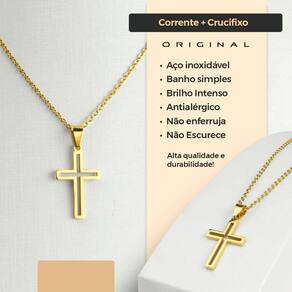 Itens Inclusos: - 1 Cordão fino dourado confeccionado em aço inox com banho dourado de alta qualidade. Comprimento aproximado de 67 cm, ideal para uso diário ou ocasiões especiais. - 1 Pingente médio em forma de crucifixo, confeccionado com banho dourado de alta qualidade, design vazado no interior que combina estilo e espiritualidade. - 1 Caixa ultra premium preta, material de alta qualidade com gravação a laser da oração completa do Pai Nosso, design sofisticado e funcional perfeito para guardar o cordão com segurança.