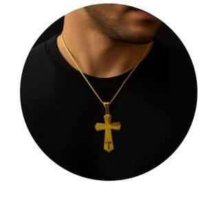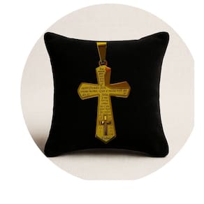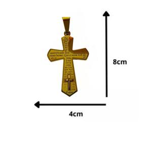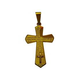 Pingente em formato de cruz com a oração do Pai Nosso gravada, produzido em aço inoxidável dourado de alta durabilidade. Possui acabamento polido, pequena cruz aplicada na base e detalhes bem definidos que valorizam a peça. Material resistente à oxidação e hipoalergênico, ideal para uso diário ou para presentear.