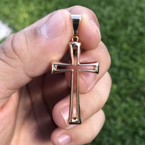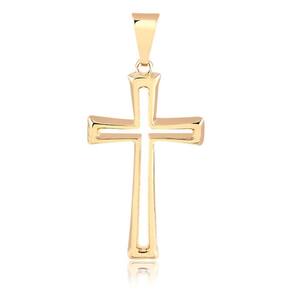 Carcterísticas do Pingente Cruz Minimalista Alongada Vazada Banhada a Ouro 18K Altura: 3,2 cm Largura: 1,8cm Peso: 2,7 gramas