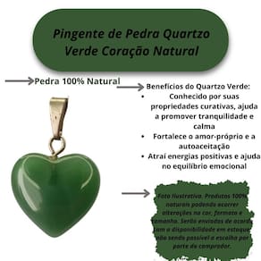 Pingente de Pedra Quartzo Verde Coração Natural Pingente de Pedra Quartzo Verde Coração Natural Adicione um toque de amor e harmonia ao seu estilo com o Pingente de Pedra Quartzo Verde Coração Natural. Feito com uma linda pedra de quartzo verde, este pingente é perfeito para quem busca não apenas beleza, mas também equilíbrio emocional e bem-estar. Benefícios do Quartzo Verde: Conhecido por suas propriedades curativas, ajuda a promover tranquilidade e calma Fortalece o amor-próprio e a autoaceitação Atraí energias positivas e ajuda no equilíbrio emocional Com um formato delicado de coração, o pingente é ideal para ser todos os dias, trazendo leveza e serenidade para o seu visual. Seja para ocasiões especiais ou para o dia a dia, esse acessório traz não só estilo, mas também as energias positivas do quartzo verde. Características: Pedra Quartzo Verde Natural Formato de coração delicado e simbólico Design atemporal e versátil Ideal para qualquer ocasião, do dia a dia a momentos especiais Sinta-se mais equilibrado e conectado com o poder do amor e da harmonia com o Pingente de Pedra Quartzo Verde Coração Natural Enviamos o seu pingente em aé 24 horas após a confirmação do pagamento Caso tenha alguma dúvida nos mande mensagem que responderemos rapidinho para te ajudar da melhor forma possível Marca: Não Informado Ean: 7894135849107