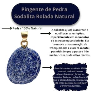Pingente de Pedra Sodalita Rolada Natural Pingente de Pedra Sodalita Rolada Natural Todos os Cristais são de origem natural, por essa razão, apresentam variações de cor e tamanhos e por serem pedras naturais podem conter fissuras, ranhuras, veios e outros em razão do processo de extração, porém todos mantém excelente qualidade Pedra Sodalita: A sodalita ajuda a acalmar e equilibrar as emoções, especialmente em momentos de ou ansiedade. Ela promove uma sensação de tranquilidade e clareza mental, permitindo que a pessoa lide melhor com os desafios diários. A sodalita é uma pedra associada ao chakra da garganta, responsável pela comunicação. Ela ajuda a melhorar a expressão verbal, permitindo uma comunicação mais clara, assertiva e sincera, tanto em situações pessoais quanto profissionais. Enviamos o seu pedido em até 24horas após a confirmação do pagamento Caso tenha alguma dúvida nos mande mensagem que responderemos rapidinho para te ajuda da melhor forma possível Marca: Não Informado Ean: 7894135849046